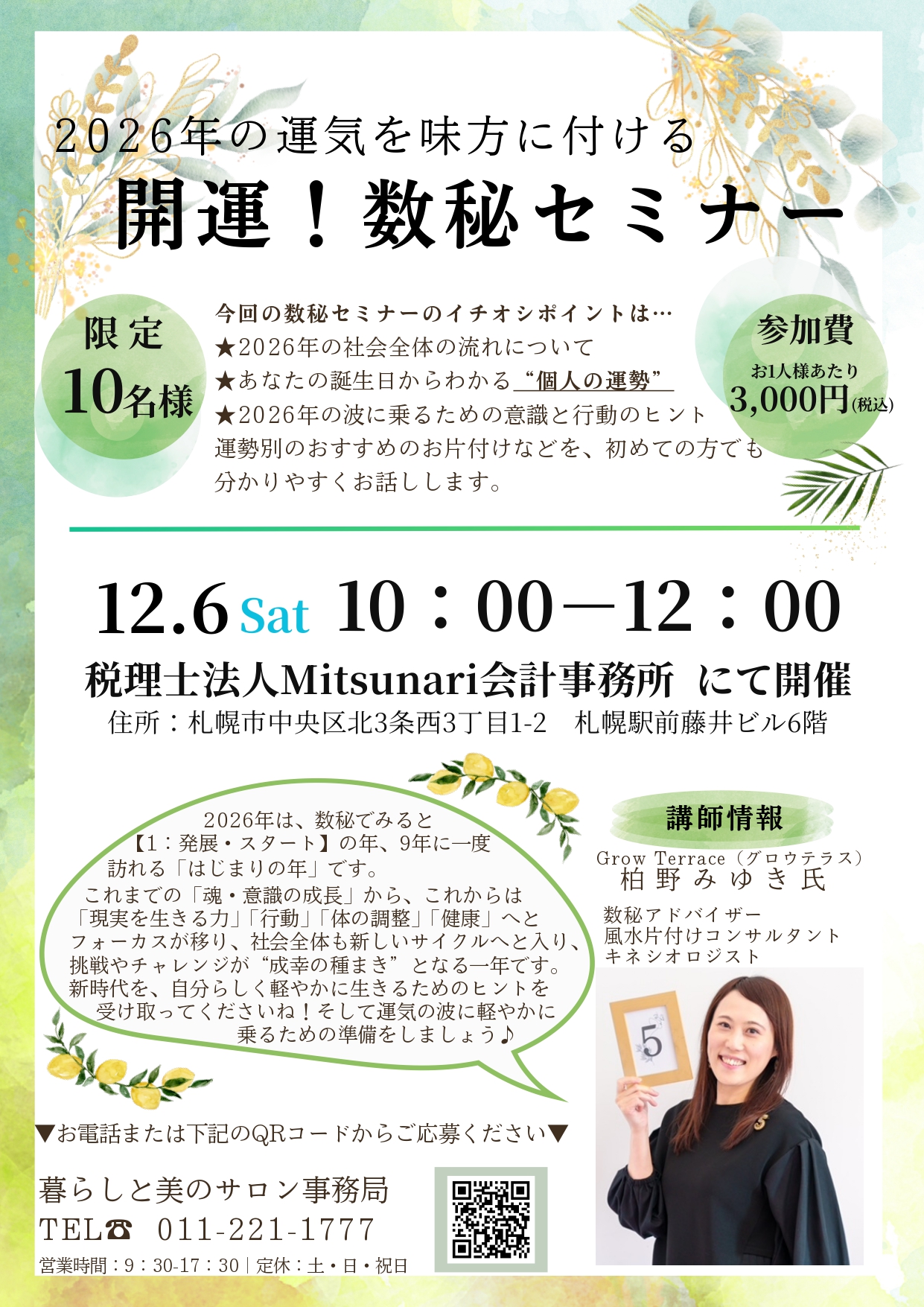 【2025.12.6開催】『2026年の運気を味方に付ける~開運!数秘セミナー』